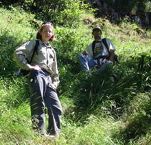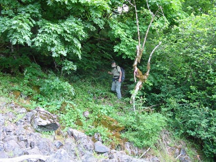 Serious bushwhacking begins on the first attempt on the face. See Emily's mosquito-bitten arm after this first attempt (not for the faint of heart!). |