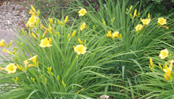 pulling weeds from a patch of day lilies, her hands in