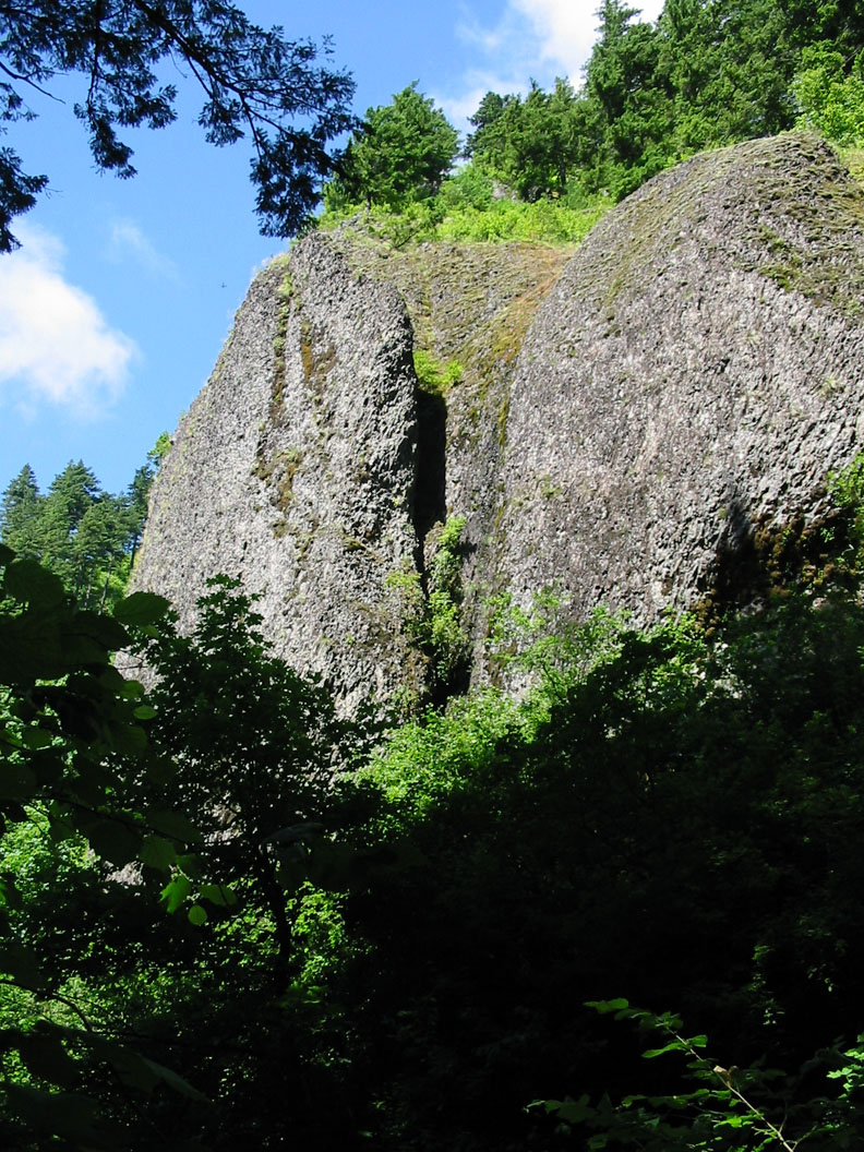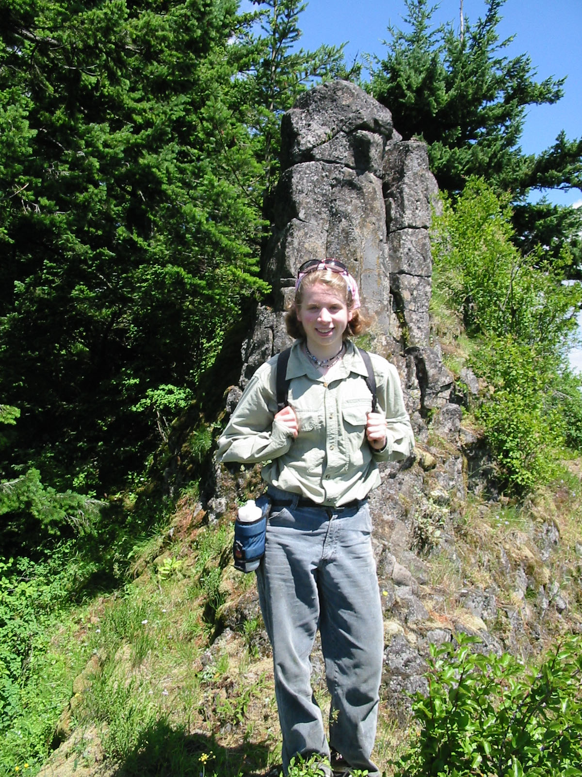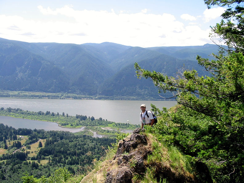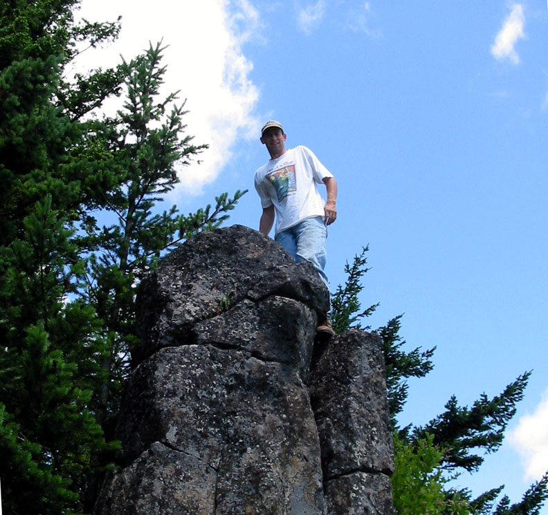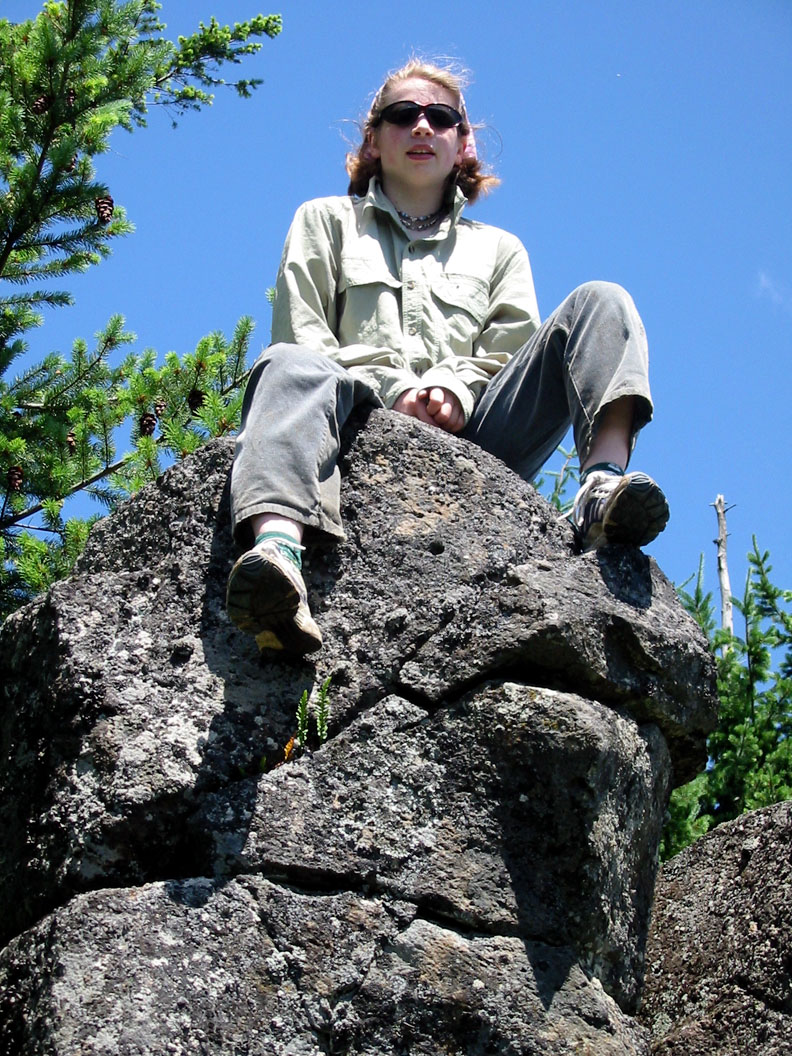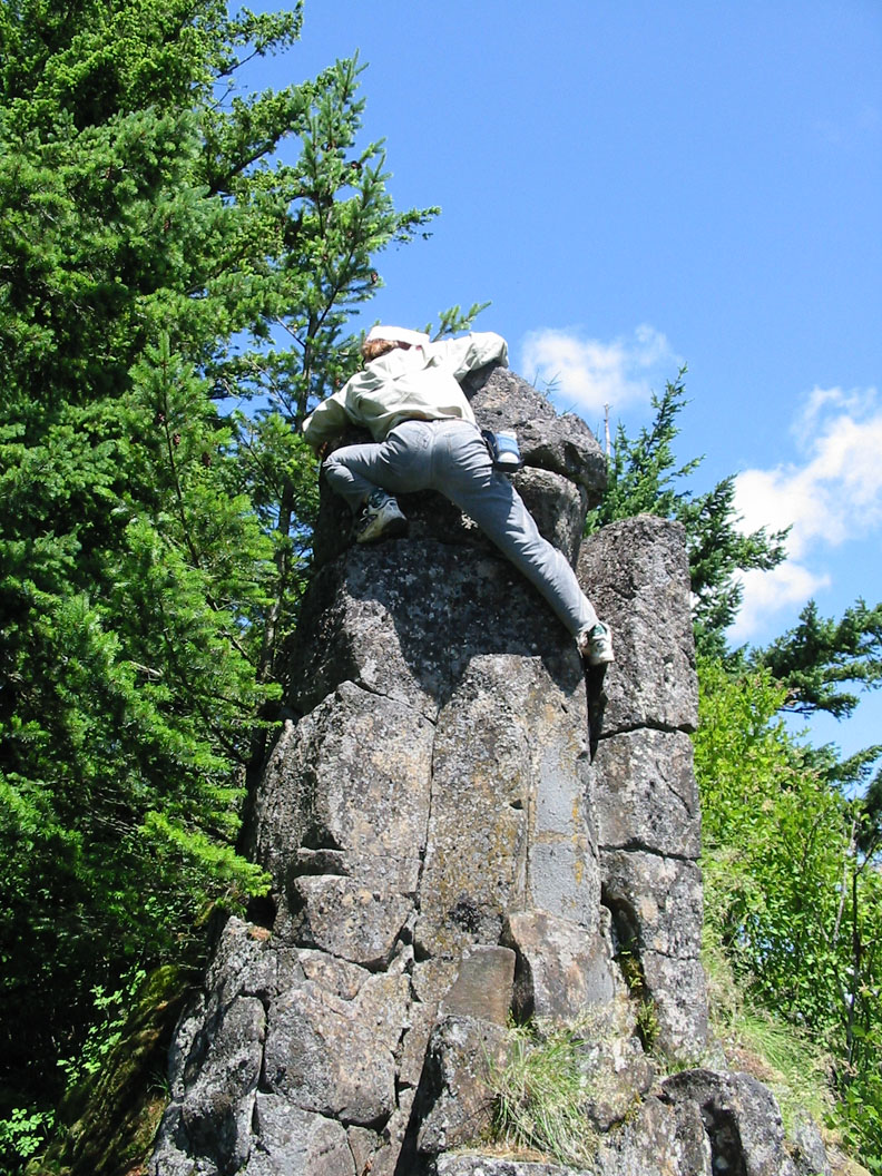 | Emily and Mac rest after the way to top is clear. | The view down from the rest spot. | Mac, on his way out to the point. |