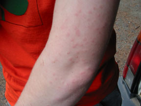 Serious bushwhacking begins on the first attempt on the face. See Emily's mosquito-bitten arm after this first attempt (not for the faint of heart!). |