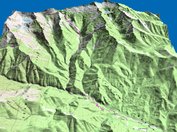This 3D rendering of an aerial photo shows the track we will take up and down