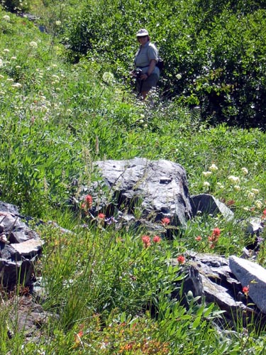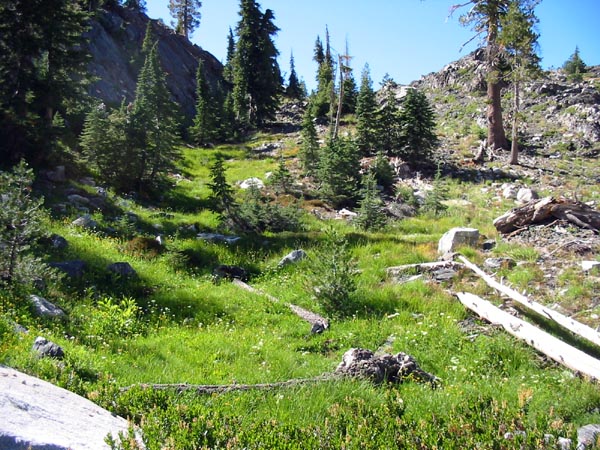 The rockfall gives way to a lovely meadow filled with wildflowers.