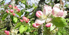 Tight rose furled is the bud of apple blossom;